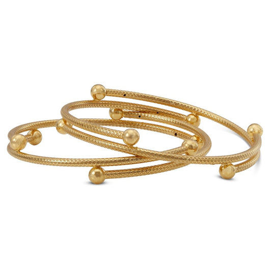 This 22KT yellow gold bangle features a textured design. The bangle showcases three curved elements, which are interconnected to render a circular bangle design. These elements are embellished with fine machine-cut designs and two gold orbs at the ends. The high-polished finish, unique, and elegant appeal of the bangle makes it a perfect match for ethnic or semi-ethnic outfits.