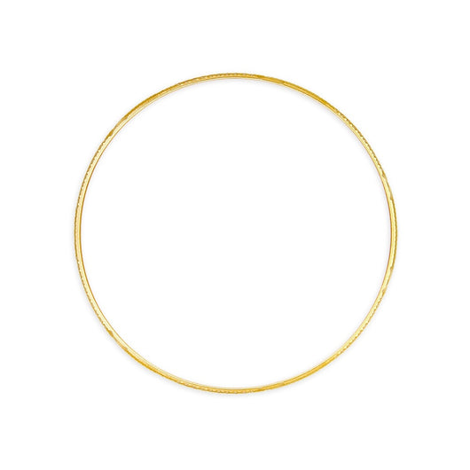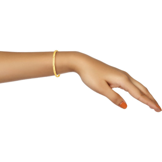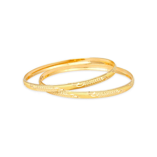 his 22KT yellow gold bangle is a pair and it has a circular design with circular elements and engravings alternatively. The areas devoid of the circular elements display small V-shaped designs. The bangles can be worn with ethnic and traditional outfits.